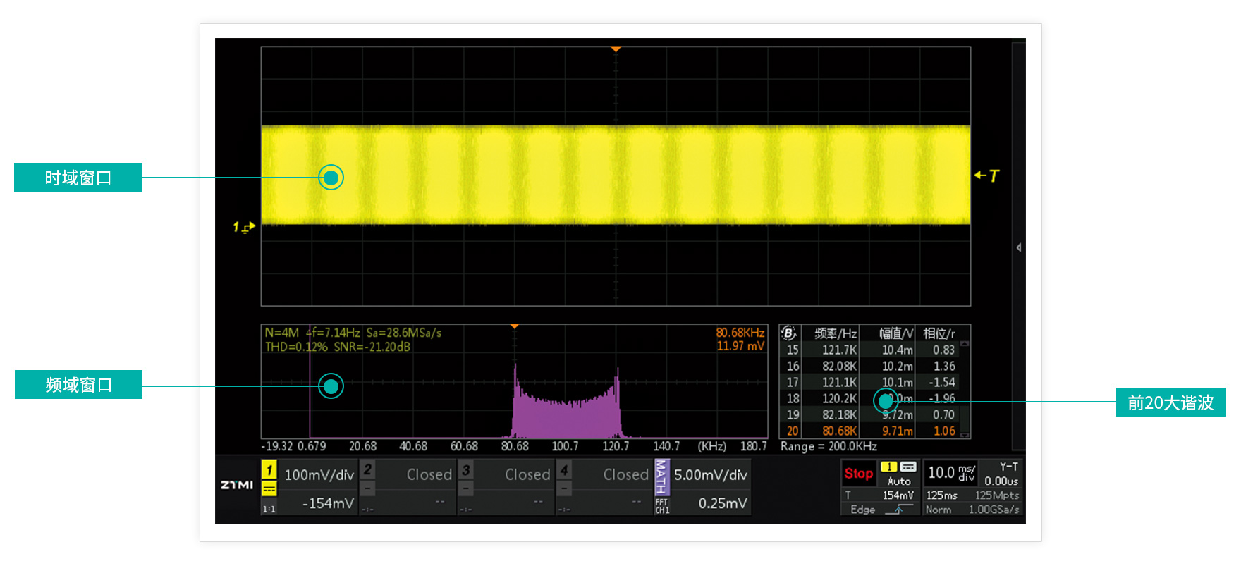 市面上多數示波器最大只支持8K樣本點的FFT分析,在1G采樣率的情況下,頻率分辨率僅有125KHz,多數情況都無法準確判斷信號頻譜分布。ZDS2024C示波器拒絕單純的功能堆砌,內部采用了專業的處理芯片,突破技術壁壘,將FFT點數升級至4M樣本點,同樣在IG采樣率的情況下頻率分辨率能精確到250Hz,可以準確分析出電路中的干擾噪聲來源,大大提高了示波器FFT的實用價值。