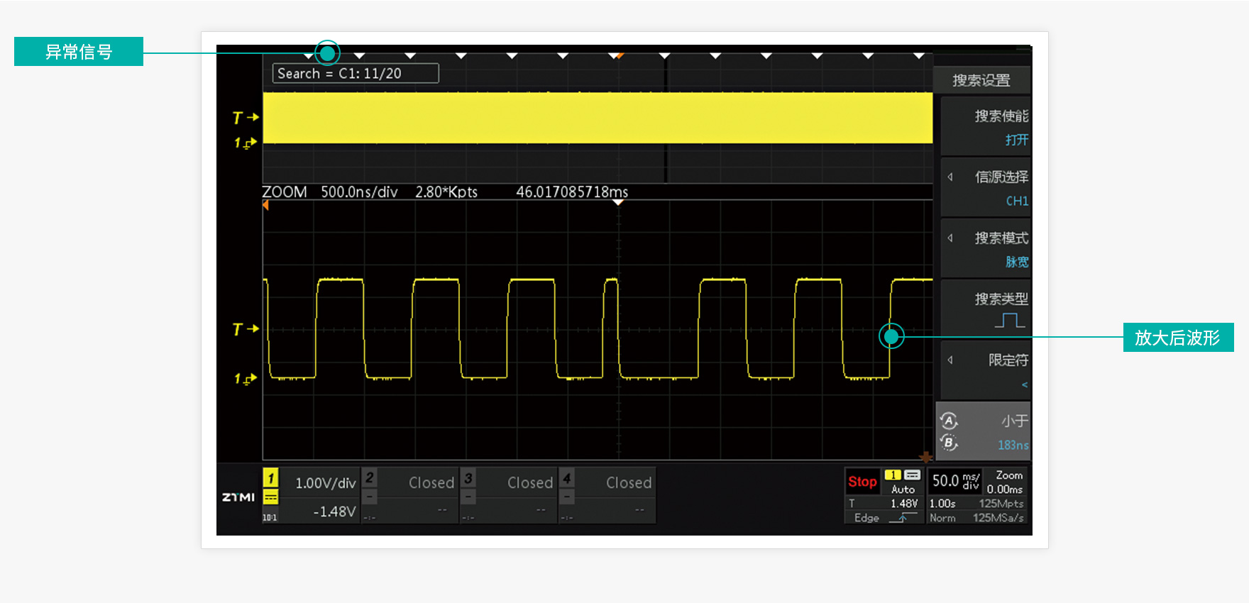 ZDS2024C 支持邊沿、脈寬、上升 / 下降時間等多種觸發搜索條件,全硬件加速,2 秒就能從海量波形里精準找到目標。同時自帶手動 + 自動兩種波形標注,標完會顯示白色三角標記,方便你快速定位、回看、分析波形。
