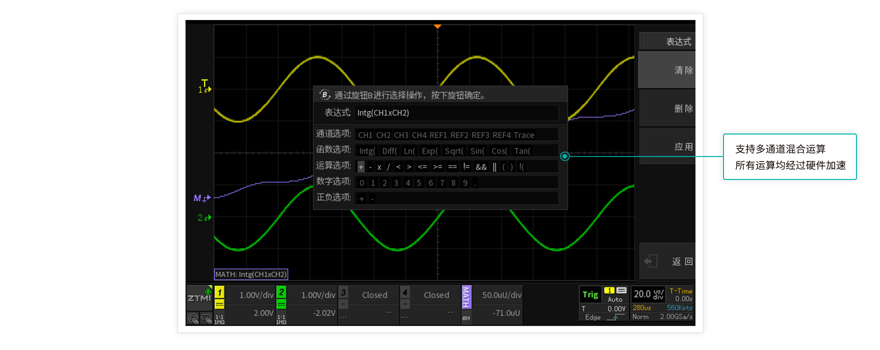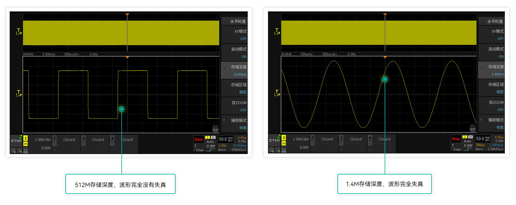 存儲深度等于采樣率乘以采樣時間,512M大存儲深度,長時間捕獲波形,依然不會出現波形失真。