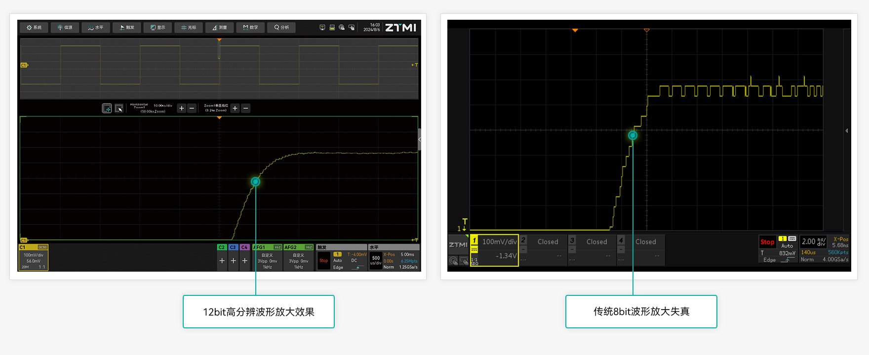ZUS5000示波器采用12bit高速ADC,垂直分辨點數達到4096點,是普通8bit示波器的16倍。ADC位數越高,示波器垂直分辨率越細,ZUS5000更精細的垂直分辨率,可以讓我們看到更真實的波形細節。