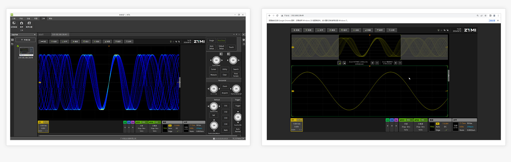 為了更方便工程師對示波器的的操作以及對波形數據的處理,ZUS6000同步提供全新一代MTA上位機軟件和全新的web遠程服務器功能,幫助工程師進行遠程控制示波器,讀取示波器波形,甚至實現腳本文件編程下發,實現示波器快速二次開發的應用。