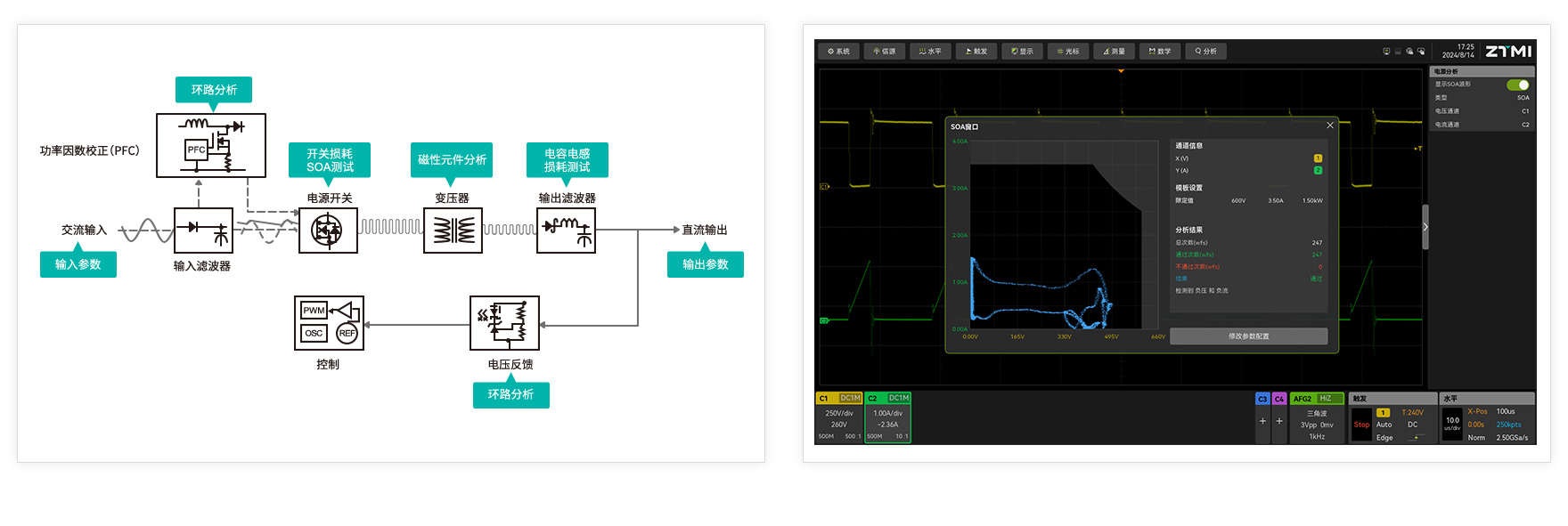 ZUS6000提供的電源分析功能涵蓋了輸入輸出特性測試,MOSFET、磁性元件、電容、電感等器件分析,調制波形測試,可以全方位評測電源產品的可靠性。