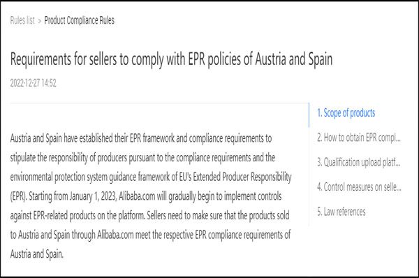 西班牙法令一出臺,速賣通和阿里巴巴國際站電商平臺就立即響應政策,不約而同頒布了EPR強制合規的要求。