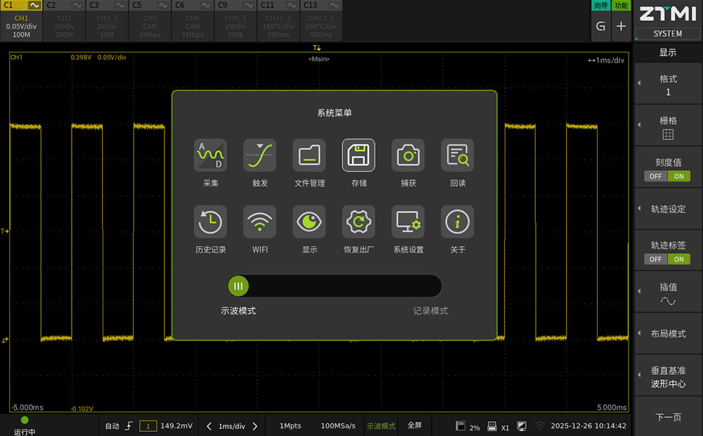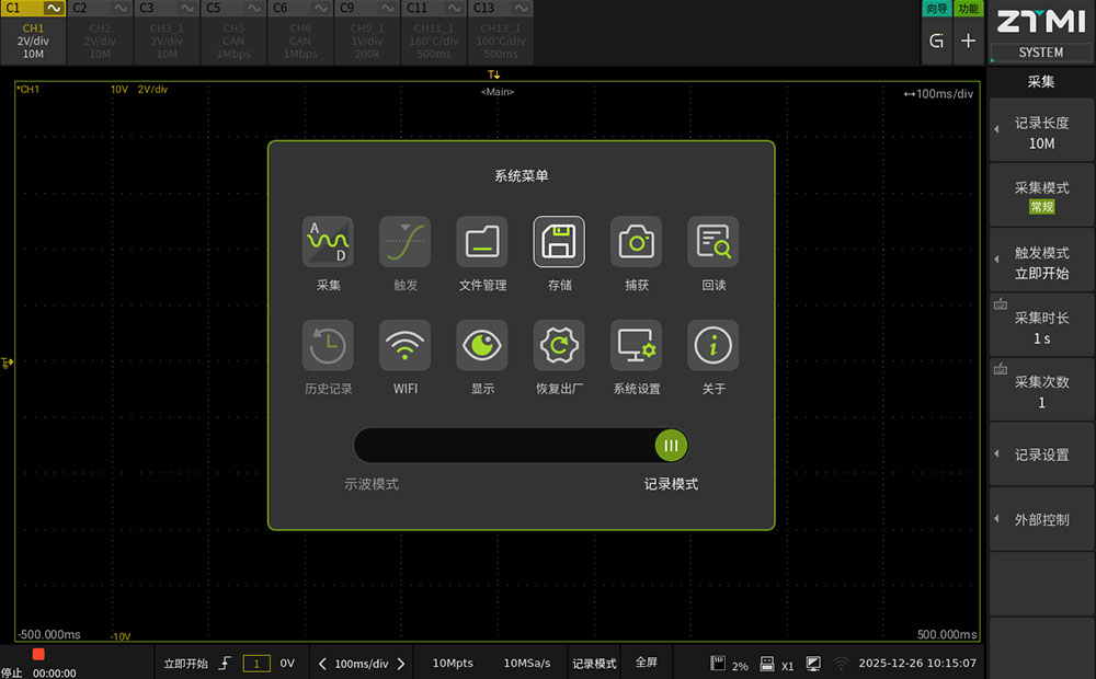 ZDL6000通過底層軟件架構的優化,實現"示波器"與"記錄儀"兩種工作模式的獨立運行。用戶通過觸屏界面的滑條即可進行功能切換,適應不同的測試階段。