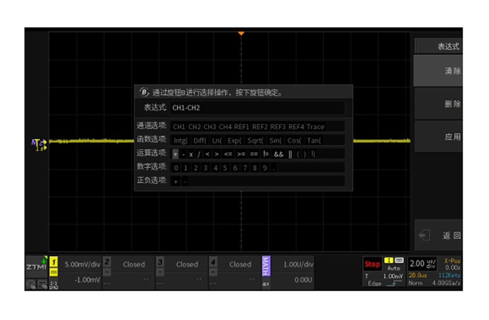 3. 打開ZDS3024E的數(shù)學(xué)運(yùn)算功能中的高級(jí)計(jì)算進(jìn)行自定義運(yùn)算,選擇"CH1 - CH2",屏幕顯示的就是市電真實(shí)波形,數(shù)值精準(zhǔn)且安全