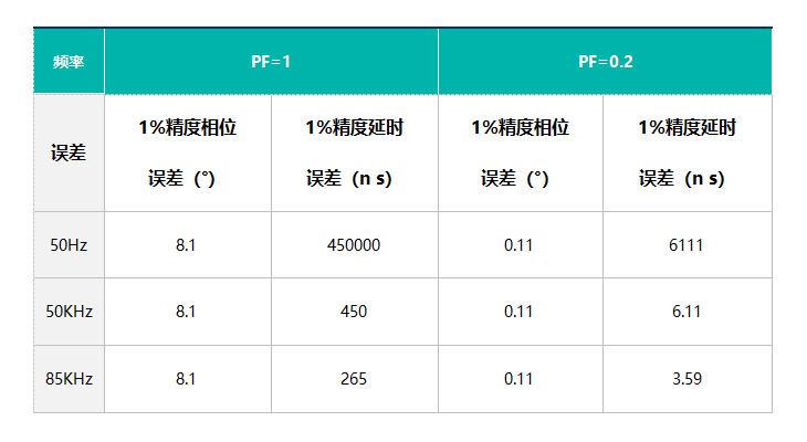 我們可以發(fā)現(xiàn),頻率相同情況下,功率因數(shù)越低,延時誤差要求越高;功率因數(shù)相同的情況下,頻率越高,延時誤差要求越高。如85KHz情況下,功率因數(shù)為0.2時,1%精度的延時誤差為3.59ns,而我們常用的電流傳感器在測試85KHz信號時,原邊信號與副邊信號相位差可能都大于3.59ns,所以測試設(shè)備必須具備相位校準(zhǔn)功能,否則根本無法準(zhǔn)確測試無線端的功率和效率。