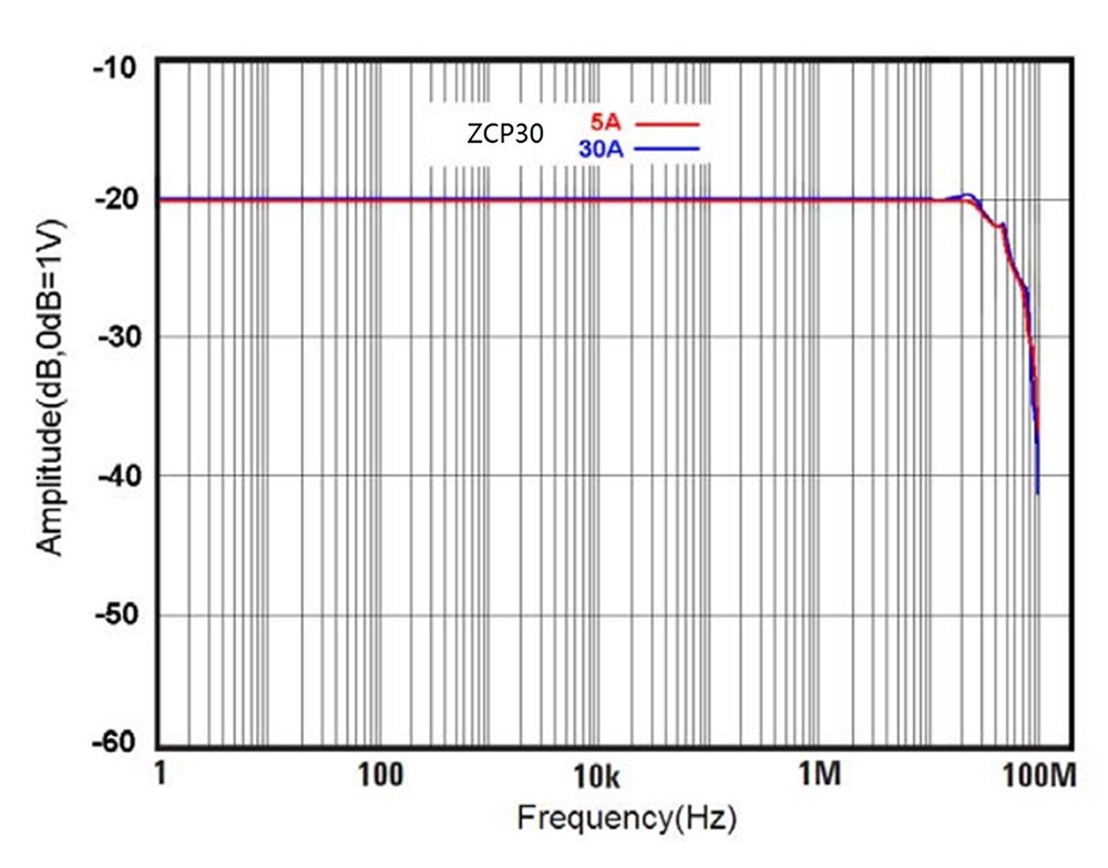 ZUS6000示波器測試無線功率時,主要的偏移誤差來自于探頭。探頭包括差分探頭和電流探頭兩類。如致遠(yuǎn)ZP1500D差分探頭和ZCP30探頭,從兩款探頭參數(shù)可以看到,ZP1500D帶寬為100MHz,ZCP30帶寬為50MHz。而目前無線充電常用到的信號頻率為幾十KHz到幾MHz范圍,其頻率大大小于探頭本身帶寬。而從探頭本身的幅頻特性來看如圖2所示,探頭測試的信號要在10MHz以上才開始出現(xiàn)衰減。因此針對無線充電信號,探頭本身不會產(chǎn)生衰減及明顯的角度誤差。