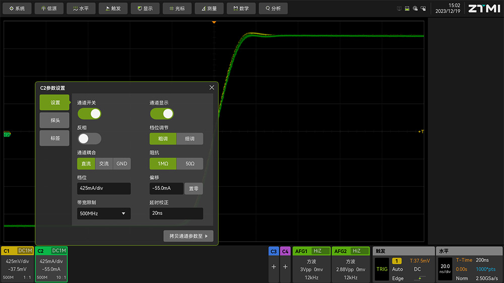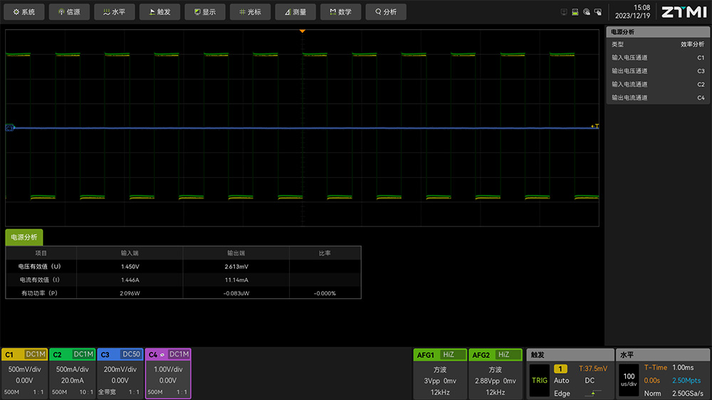 1、 根據(jù)實(shí)際的電壓探頭和電流探頭的連接情況,打開相應(yīng)通道并設(shè)置探頭類型和探頭比率。