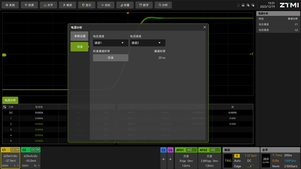 之前點(diǎn)擊"分析"菜單,找到**"電源分析"**功能,打開電源分析功能后,在彈出的菜單中選擇校準(zhǔn)功能,點(diǎn)擊"校準(zhǔn)"開始校準(zhǔn),如圖8所示,校準(zhǔn)后波形會自動呈現(xiàn)在屏幕上,如圖9所示。