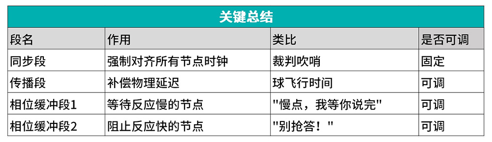 有些隊友(節點)反應慢,這個階段是主動等待他們跟上節奏。如果信號邊沿來得比預期晚,會延長這個段來重新同步。長度可調。相當于你傳球后,發現接球人還沒準備好,就多等一會兒。